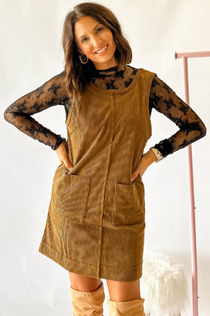 Beige Corduroy Sleeveless Mini Dress With Patched Pockets