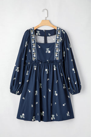 Blue Floral Embroidered Square Neck Puff Sleeve Ruffled Mini Dress