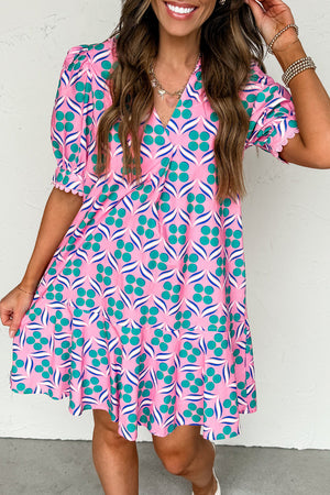 Pink Geometric Floral Print V Neck Ricrac Trim Short Sleeve Mini Dress