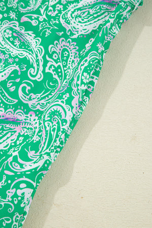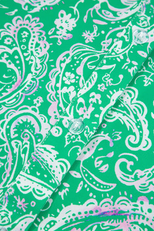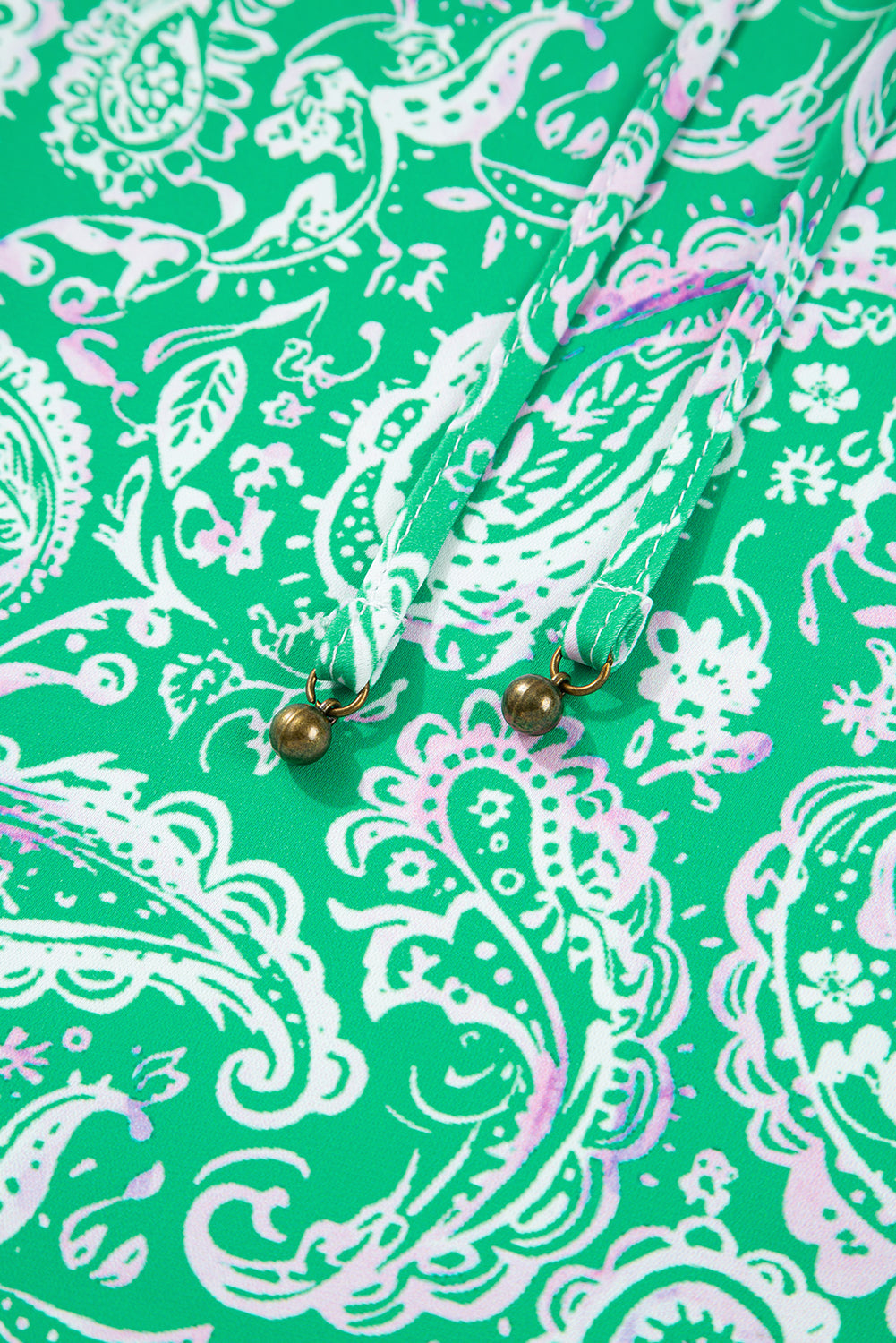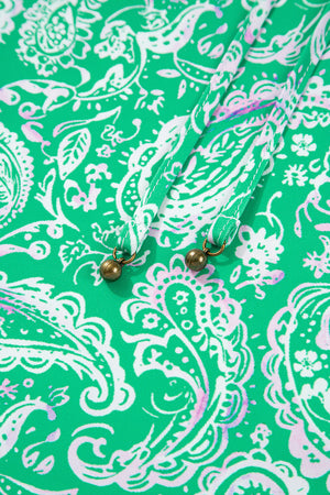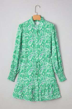 Green Paisley Print Long Sleeve Button Front Tied Waist Mini Dress