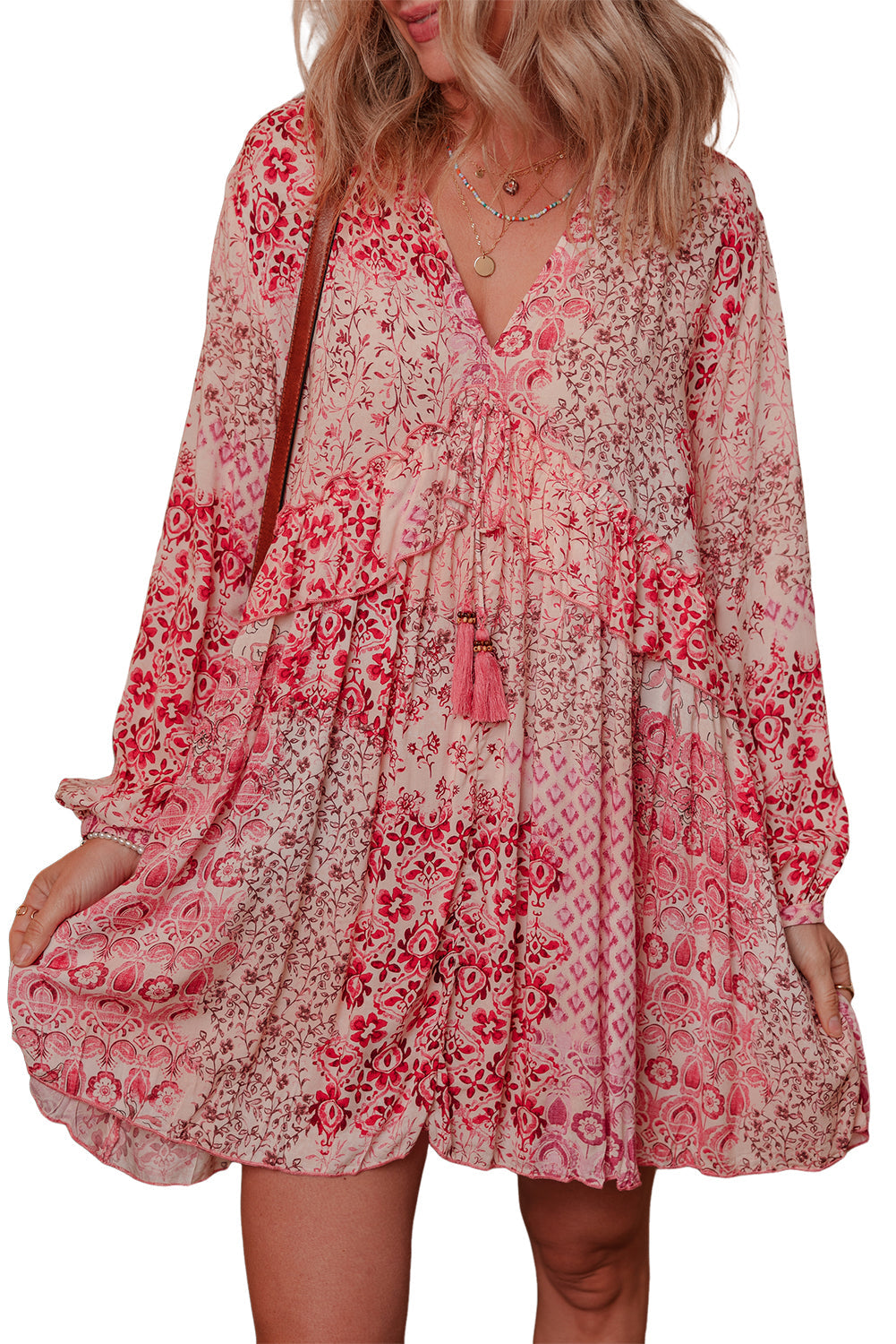 Pink Bohemian Floral Print Tassel Tie Long Sleeve Flowy Mini Dress