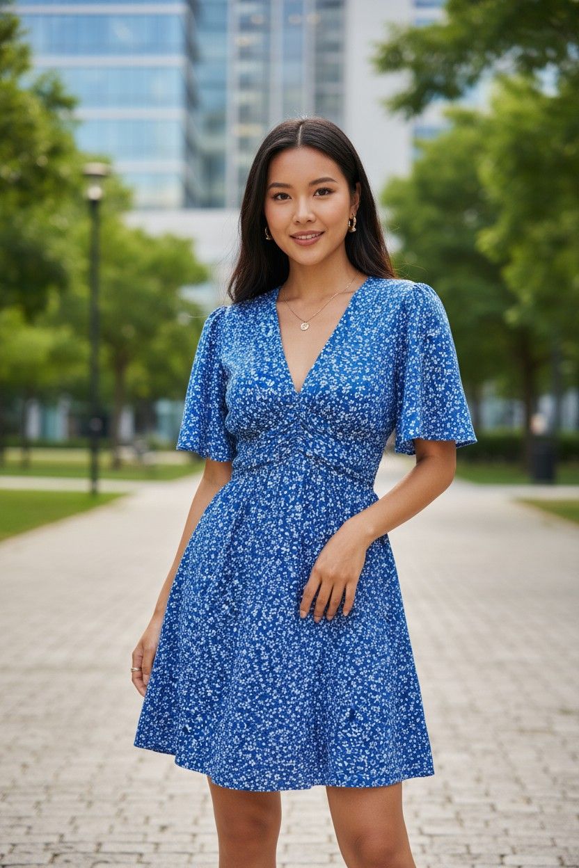 Deep V-Neck Summer New Ruffled Sleeve With Small Floral Resort Style Dress