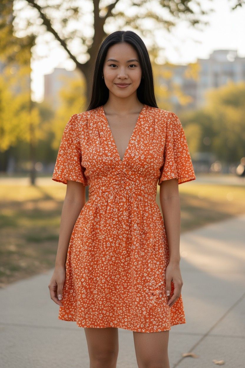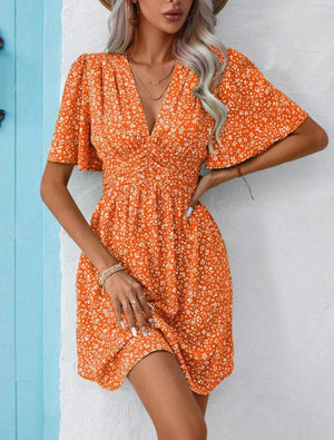 Deep V-Neck Summer New Ruffled Sleeve With Small Floral Resort Style Dress