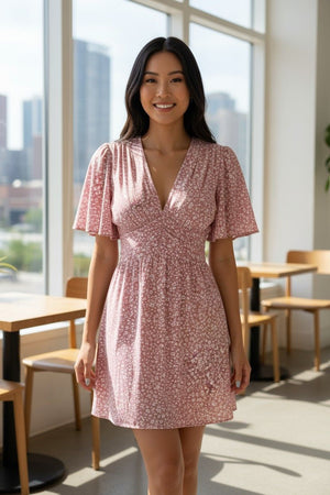 Deep V-Neck Summer New Ruffled Sleeve With Small Floral Resort Style Dress