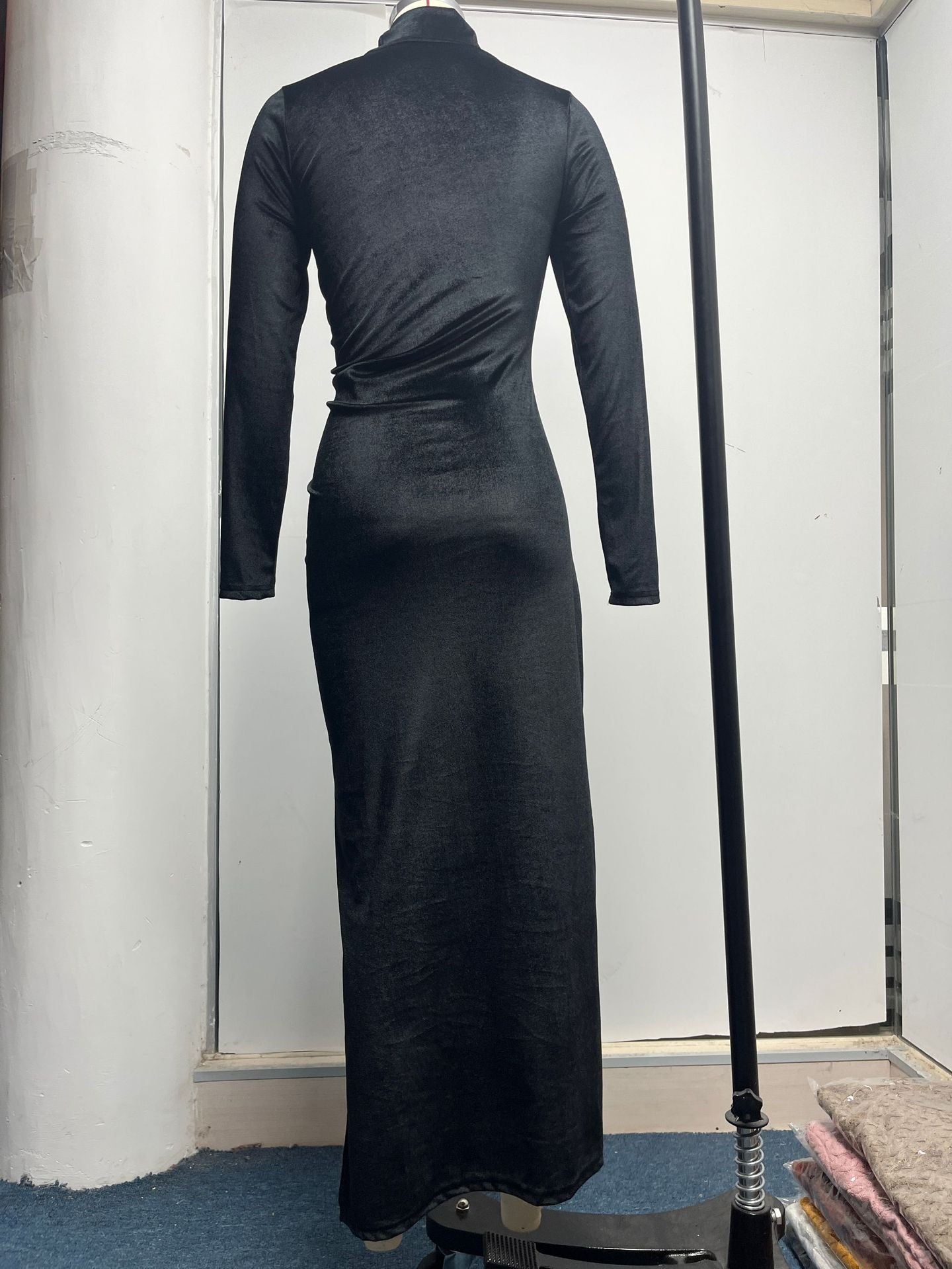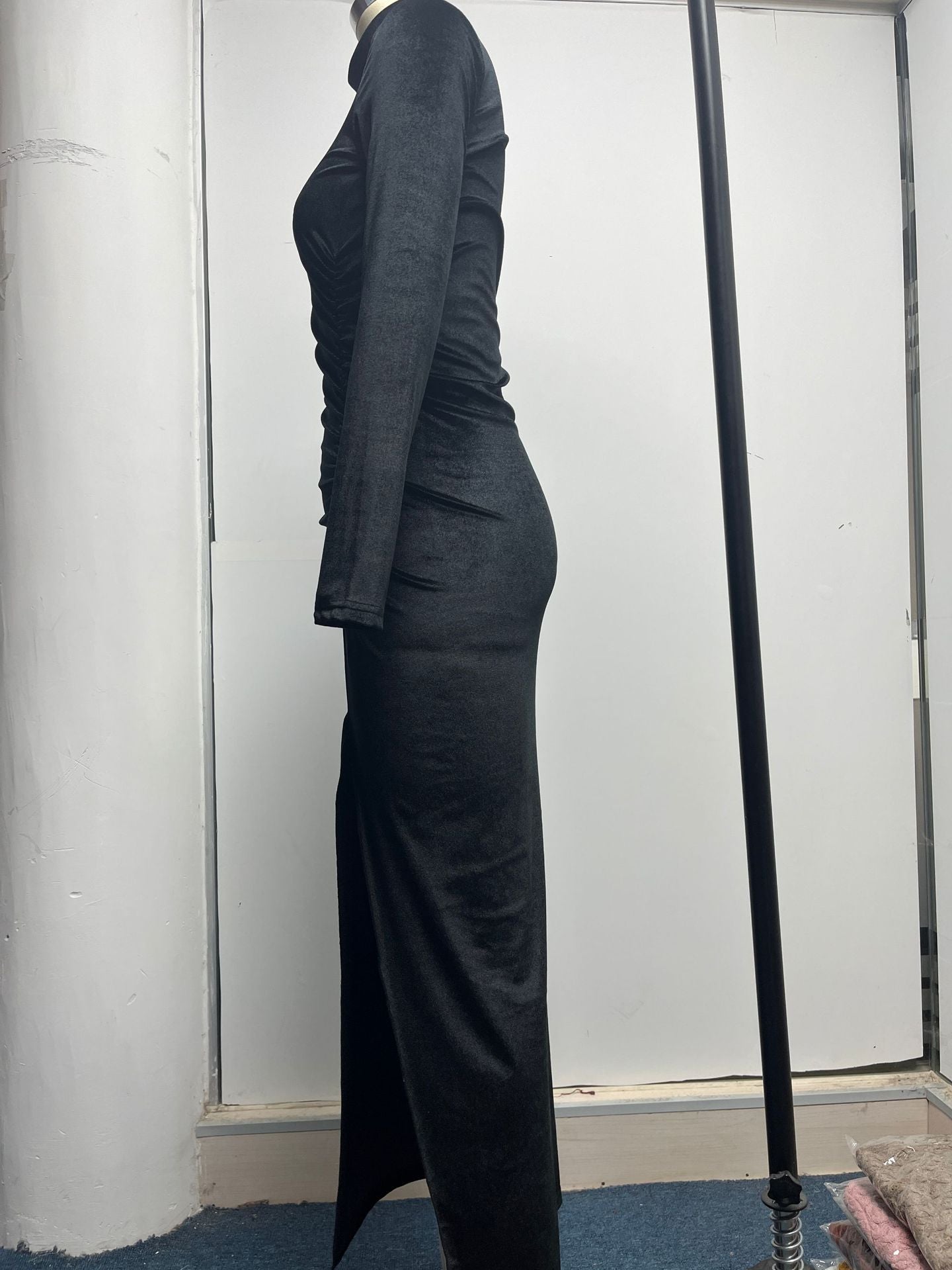 High-Neck Velvet Dress Slim Pleated Slit Dress