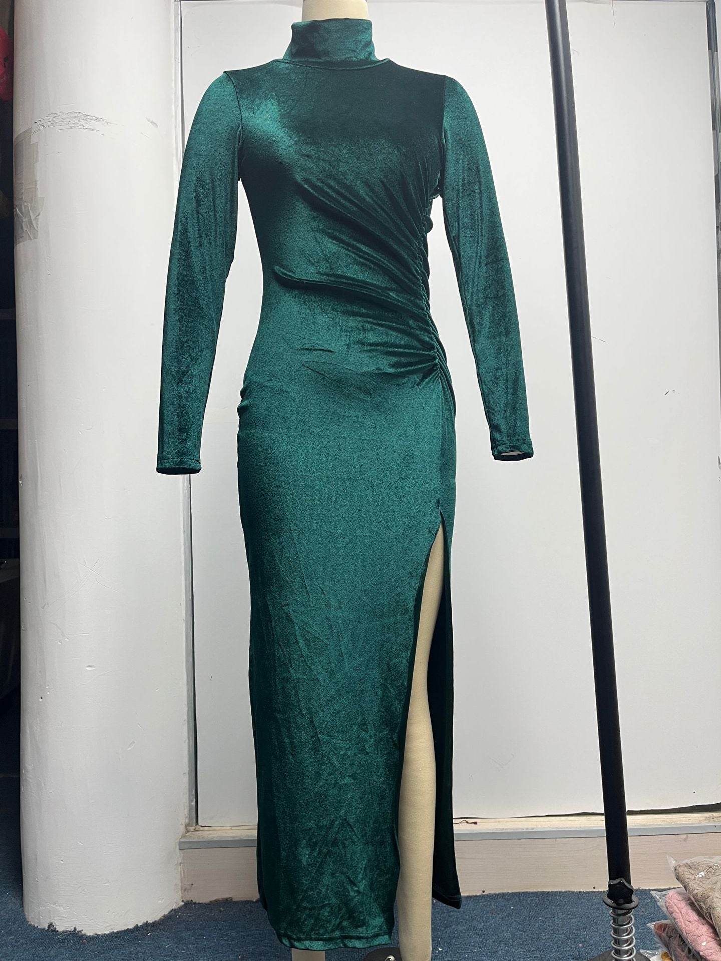 High-Neck Velvet Dress Slim Pleated Slit Dress