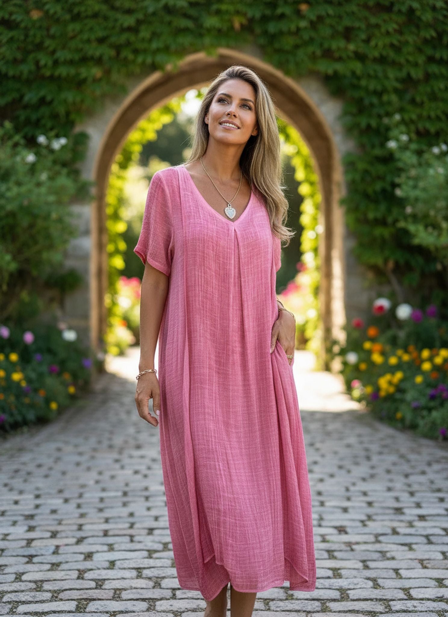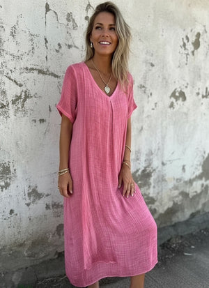 Loose Casual Fashion Cotton And Linen V-Neck Cotton And Linen Short Sleeve Dress