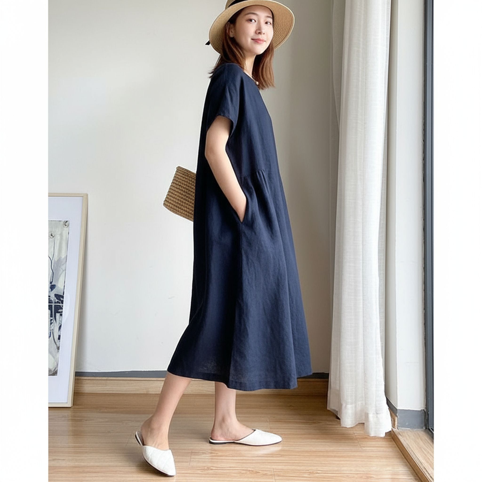 Loose Skirt Short Sleeve Crew Neck Solid Color Cotton And Linen Dress