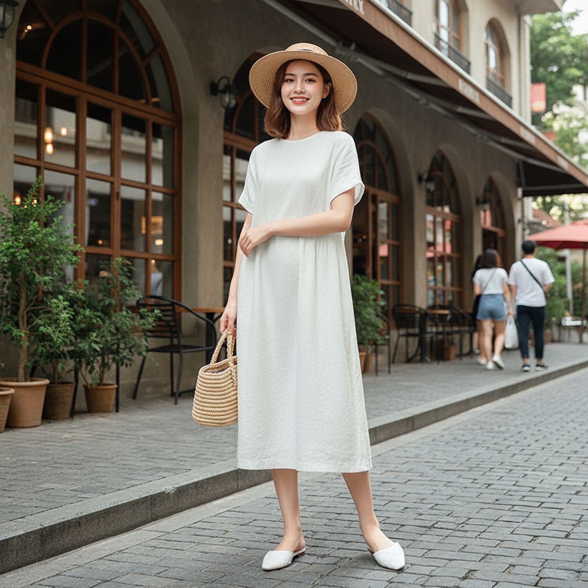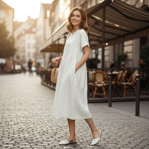 Loose Skirt Short Sleeve Crew Neck Solid Color Cotton And Linen Dress