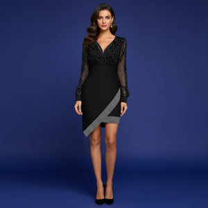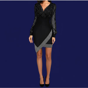 Mesh Sequin Splicing Sexy V-Neck Temperament Elegant Long-Sleeved Dress For Women