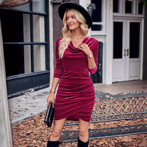 New Casual Solid Color Swing Collar Long Sleeve Fleece Dress