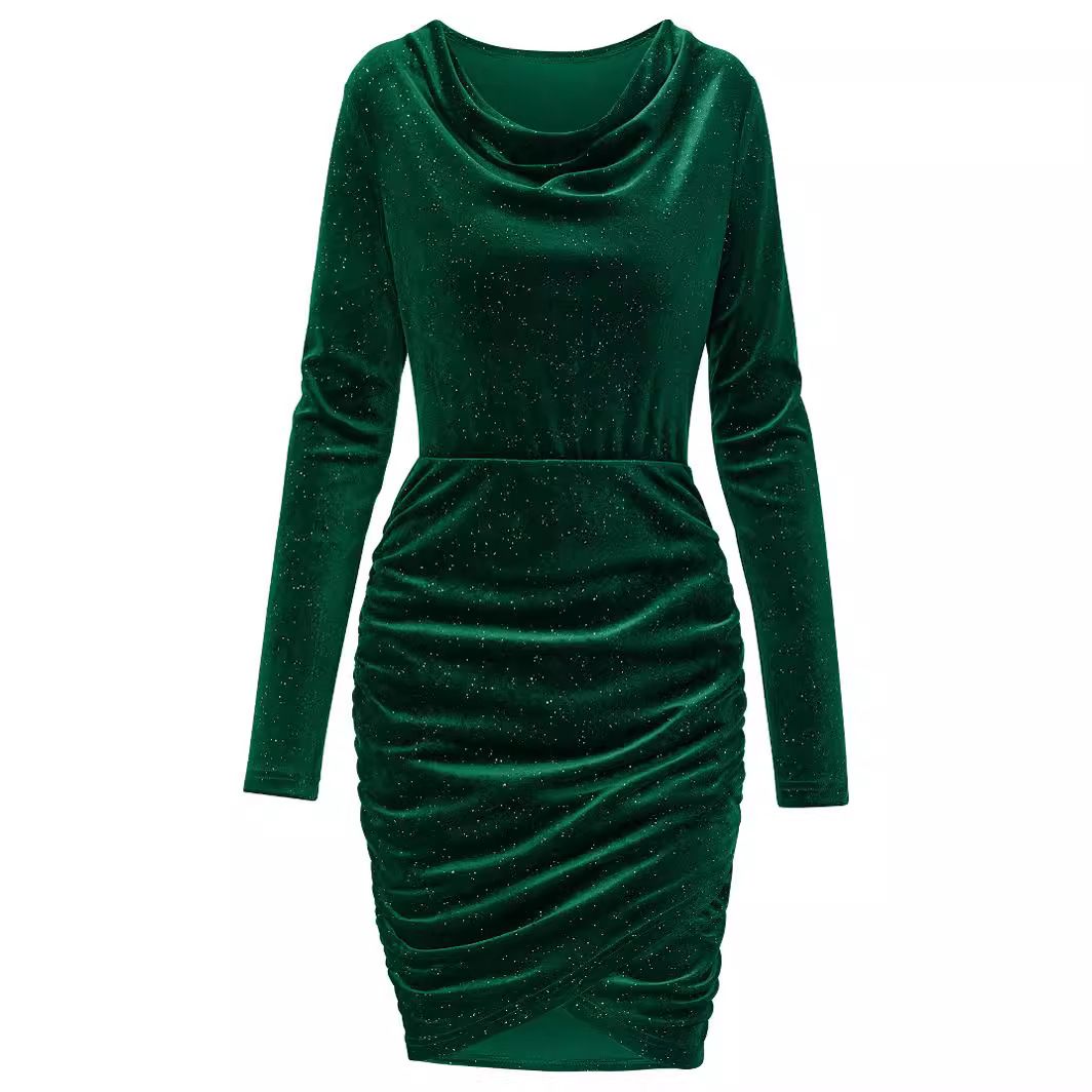 New Casual Solid Color Swing Collar Long Sleeve Fleece Dress
