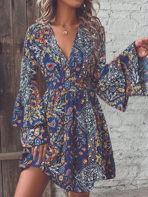 New Fashionable And Elegant Women'S Paisley Print V-Neck Flared Sleeve Dress