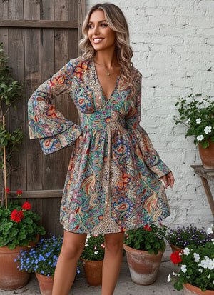 New Fashionable And Elegant Women'S Paisley Print V-Neck Flared Sleeve Dress