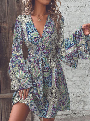 New Fashionable And Elegant Women'S Paisley Print V-Neck Flared Sleeve Dress