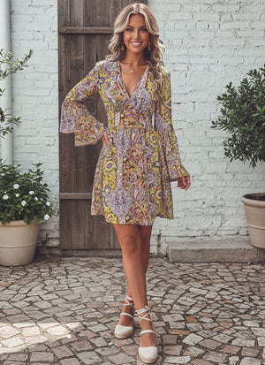 New Fashionable And Elegant Women'S Paisley Print V-Neck Flared Sleeve Dress