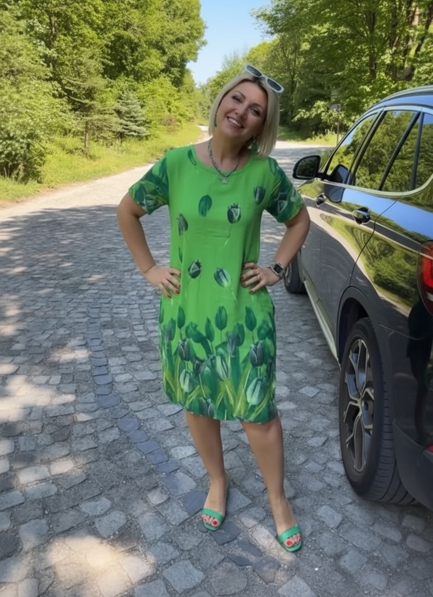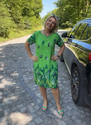New Flower Print Loose Casual Crew Neck Dress Green