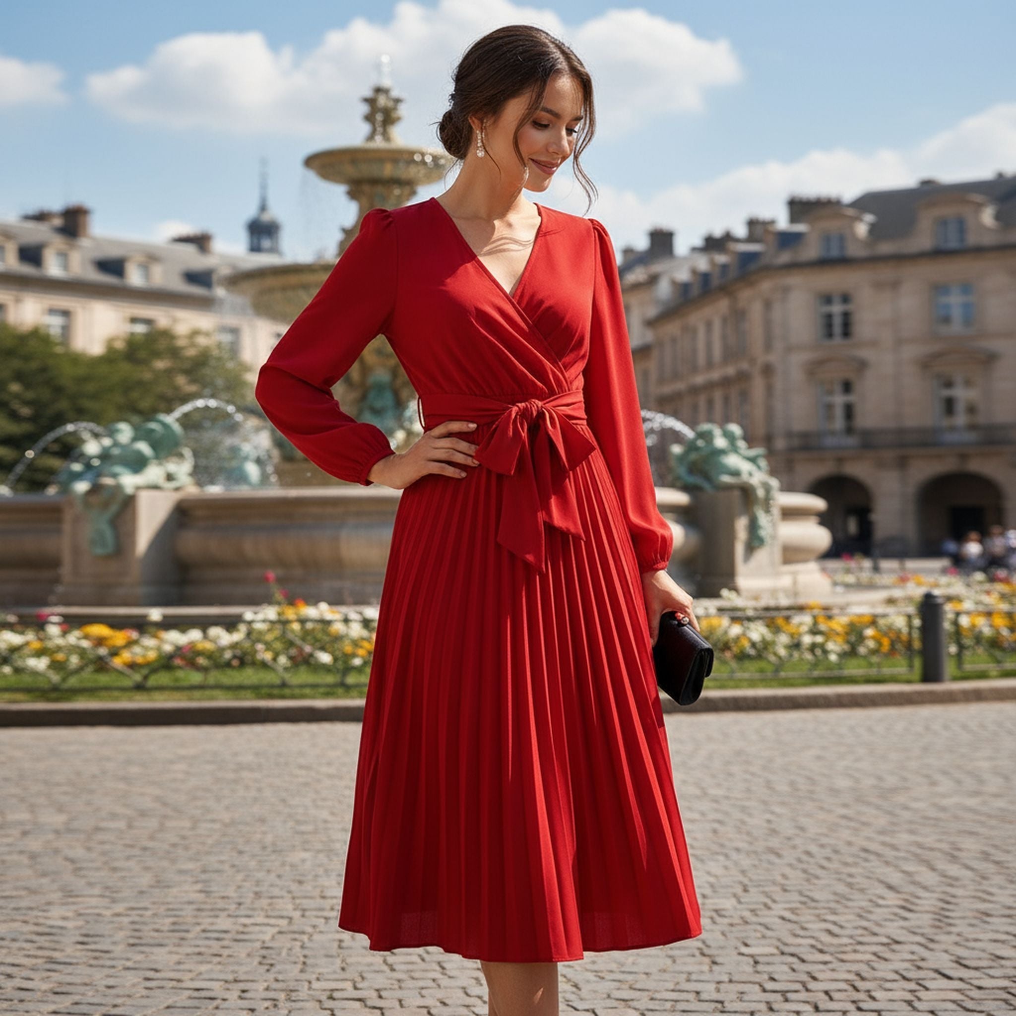New Long-Sleeved Slim Pleated Belt V-Neck Dress