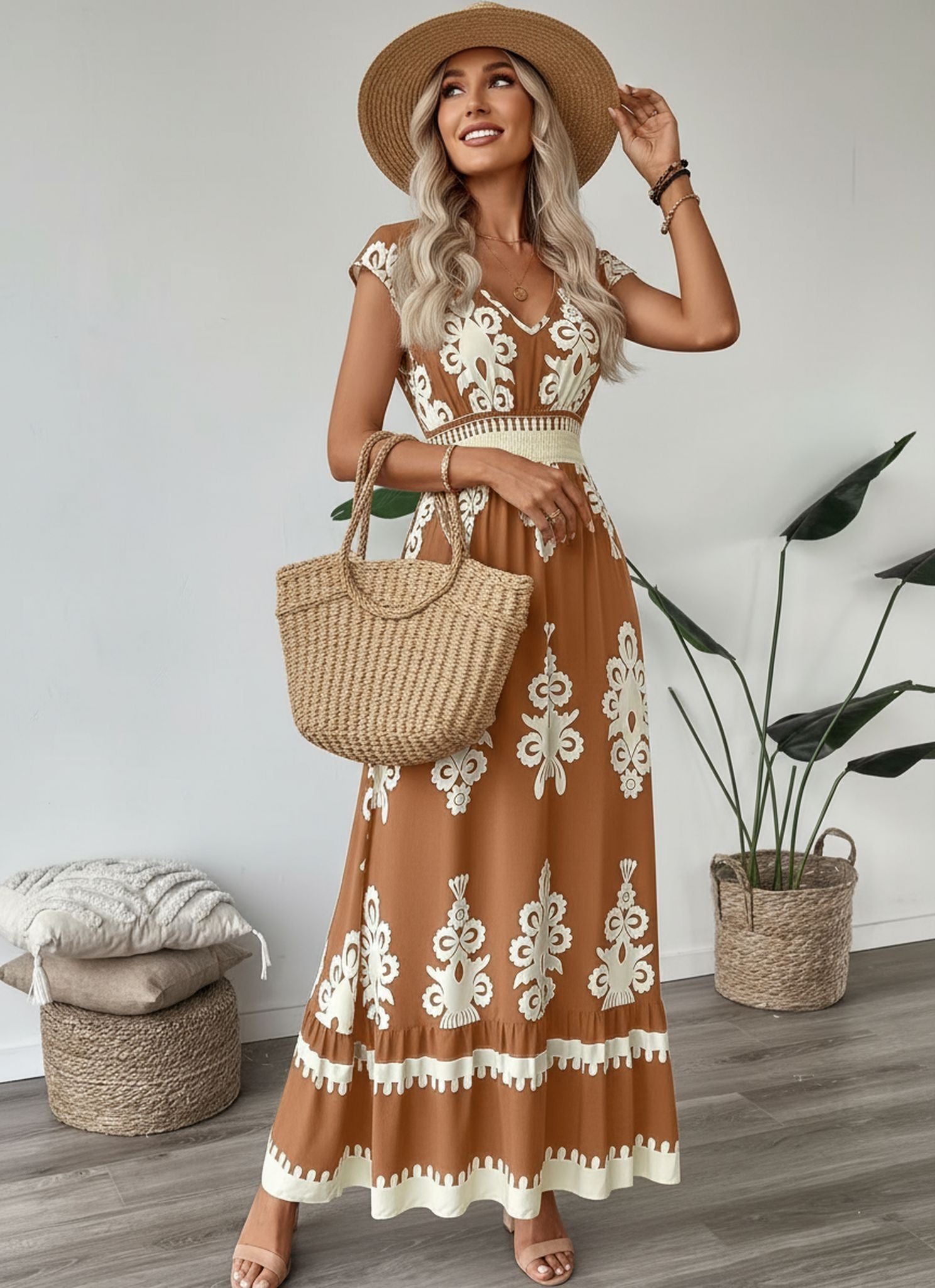 New Summer Fashion Printed V-Neck Waist Long Dress
