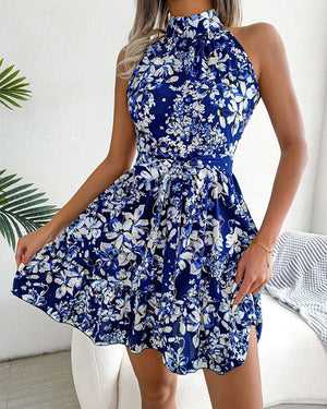 New Summer Sleeveless Floral Halterneck Waist Dress For Women