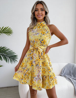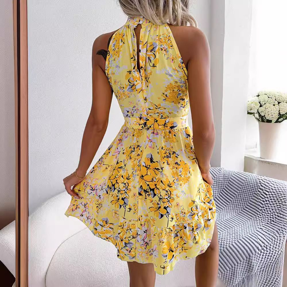 New Summer Sleeveless Floral Halterneck Waist Dress For Women