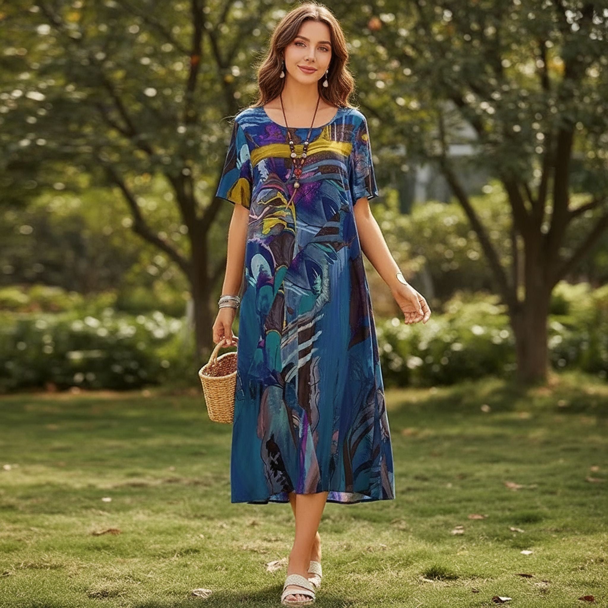 Printed Dress Summer Short Sleeve Tunic Round Neck Loose Beach Long Skirt