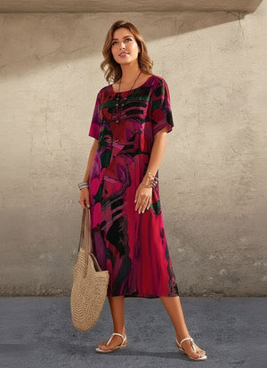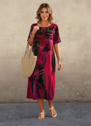 Printed Dress Summer Short Sleeve Tunic Round Neck Loose Beach Long Skirt
