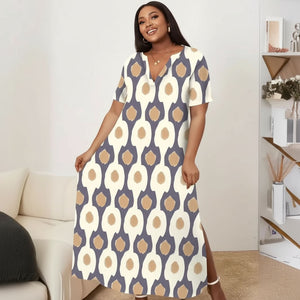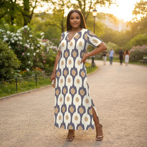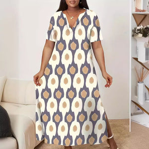 Short-Sleeved Printed V-Neck Long Dress