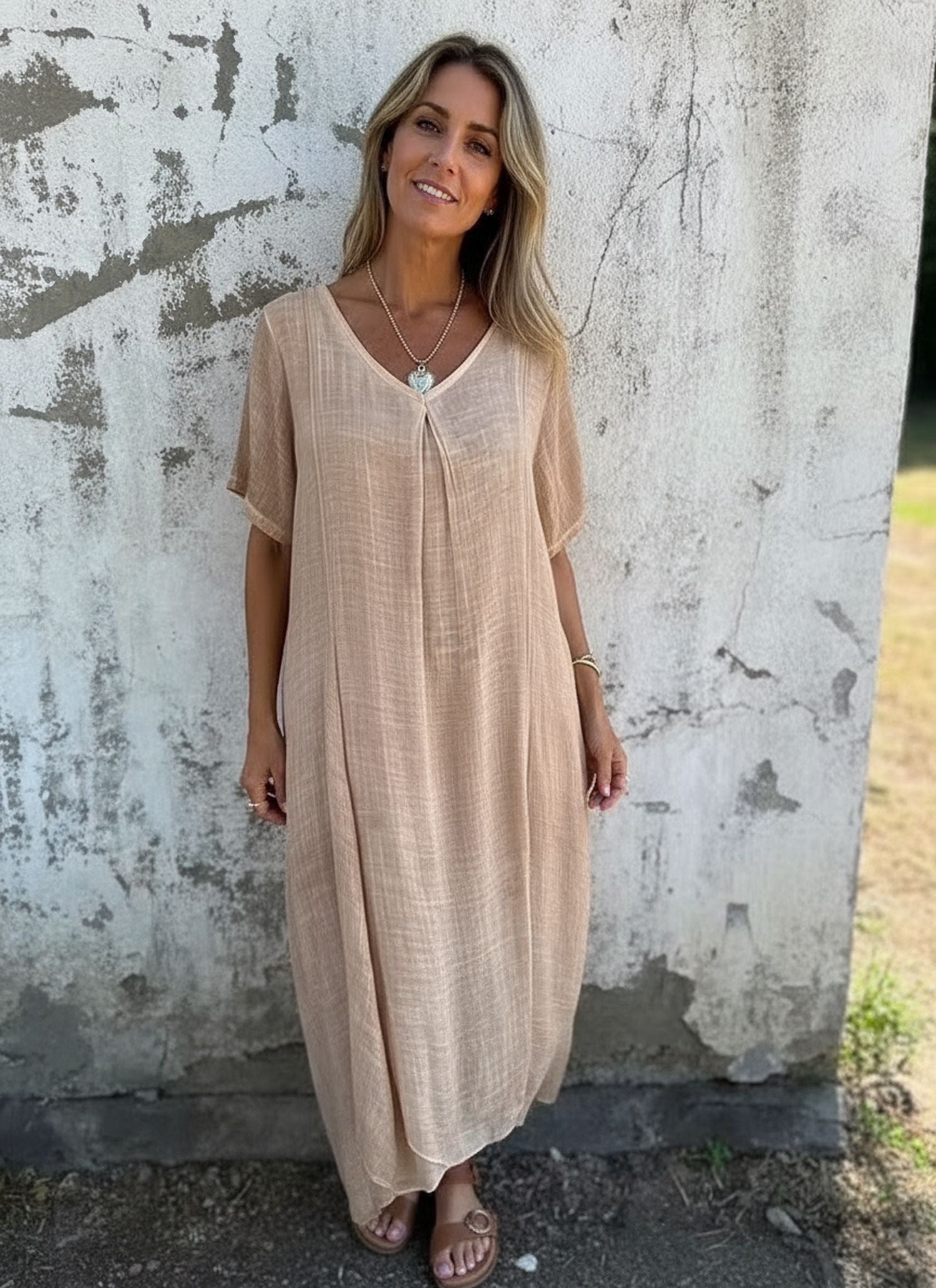 Summer Loose Skirt Short Sleeve V-Neck Solid Color Cotton And Linen Dress