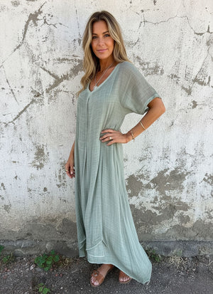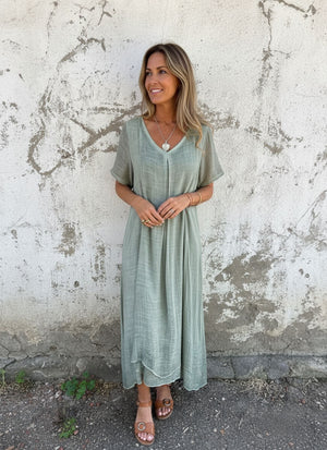 Summer Loose Skirt Short Sleeve V-Neck Solid Color Cotton And Linen Dress