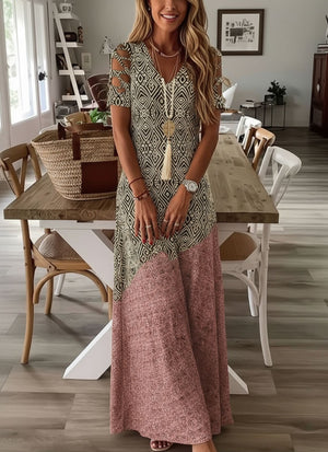 Summer V-Neck Thread Hollow Casual Fashion Print Dress Long Skirt