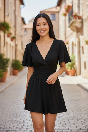 Summer'S New Deep V-Neck Ruffled Sleeve Solid Color Tuck Dress
