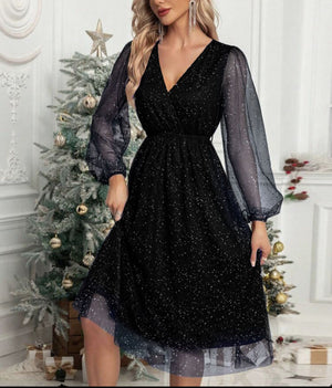 V-Neck Elegant Slim Solid Color Spliced Mesh See-Through Powder Dress