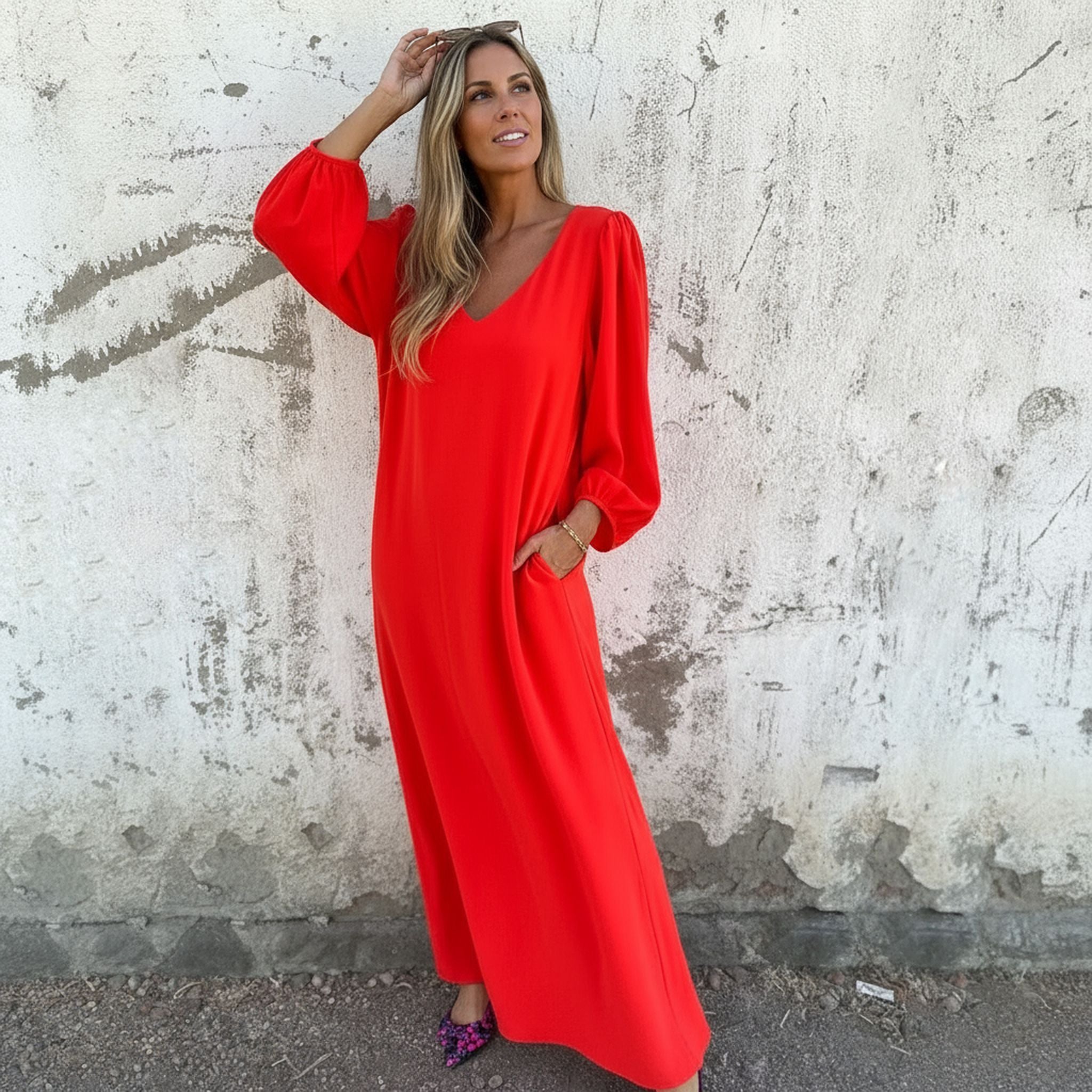 V-Neck Solid Color Women'S Lantern Sleeve Dress
