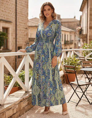 Winter New Temperament V-Neck Print Long-Sleeved Dress