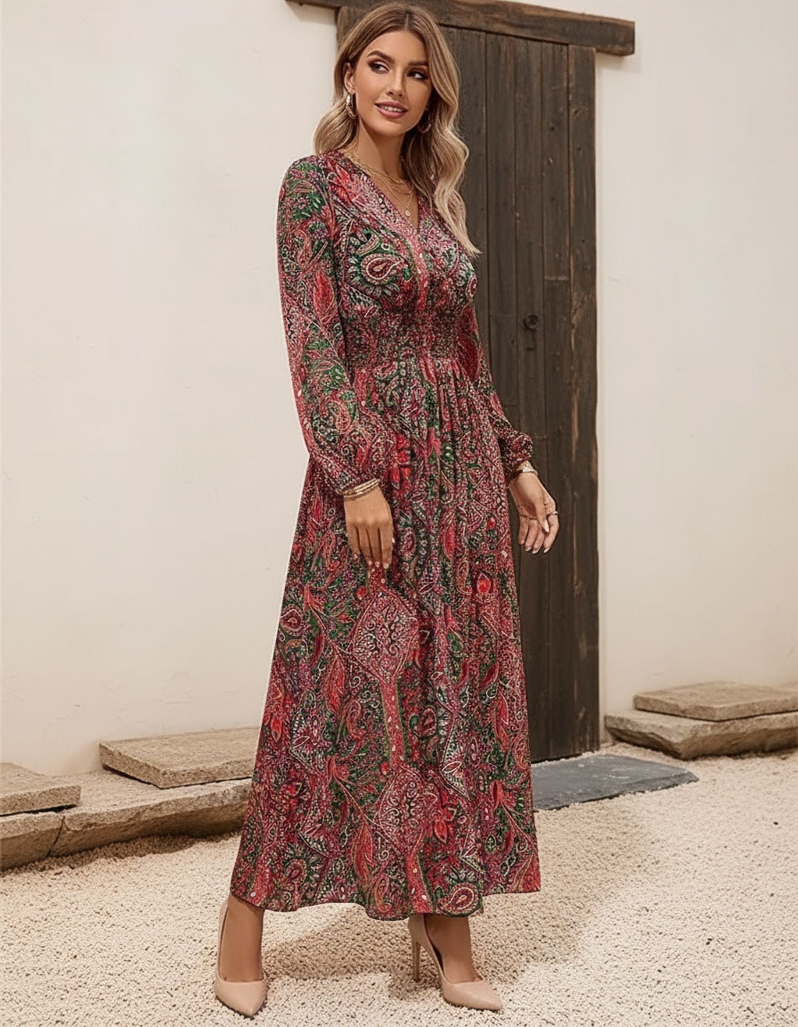 Winter New Temperament V-Neck Print Long-Sleeved Dress