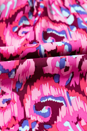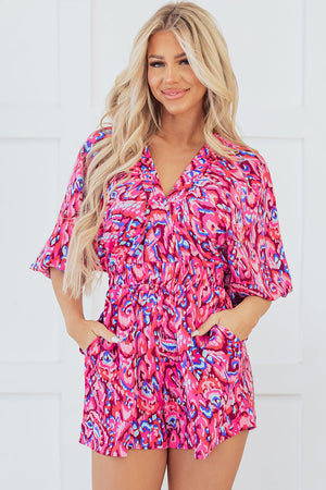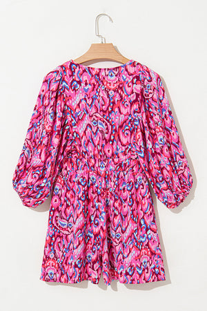Pink Abstract Print Puff Sleeve V Neck High Waist Romper