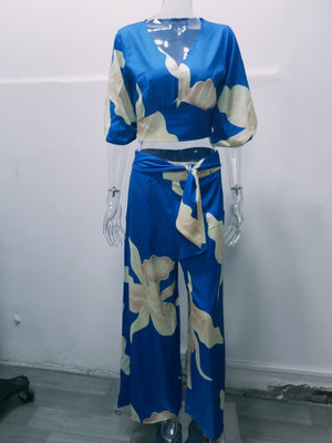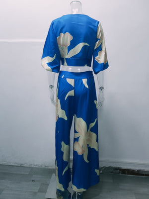 V-Neck, Lantern Sleeve Cropped Top, High-Waisted Wide-Leg Pants, Two-Piece Set
