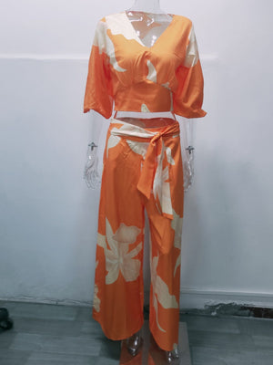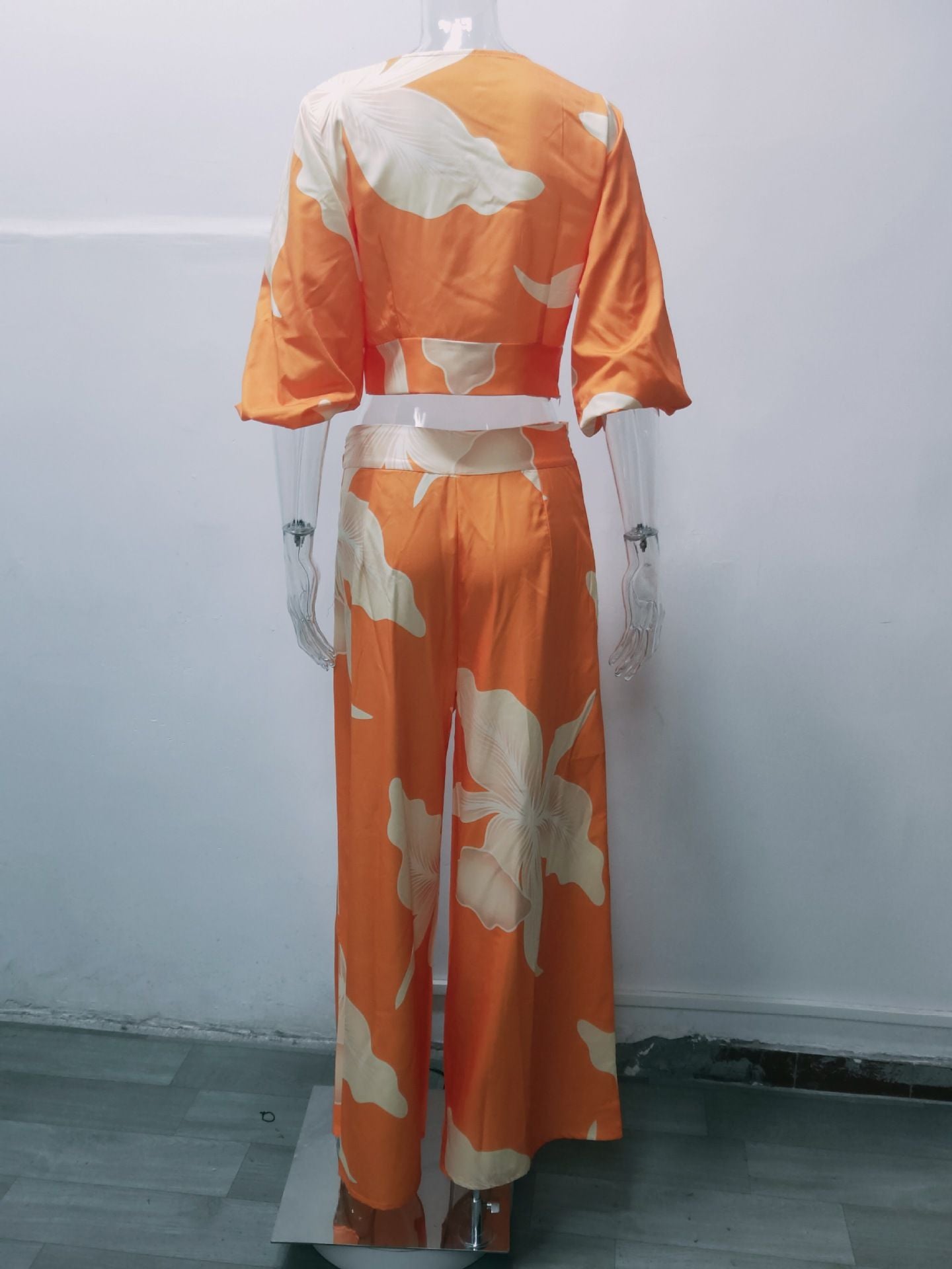 V-Neck, Lantern Sleeve Cropped Top, High-Waisted Wide-Leg Pants, Two-Piece Set