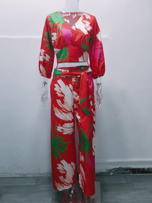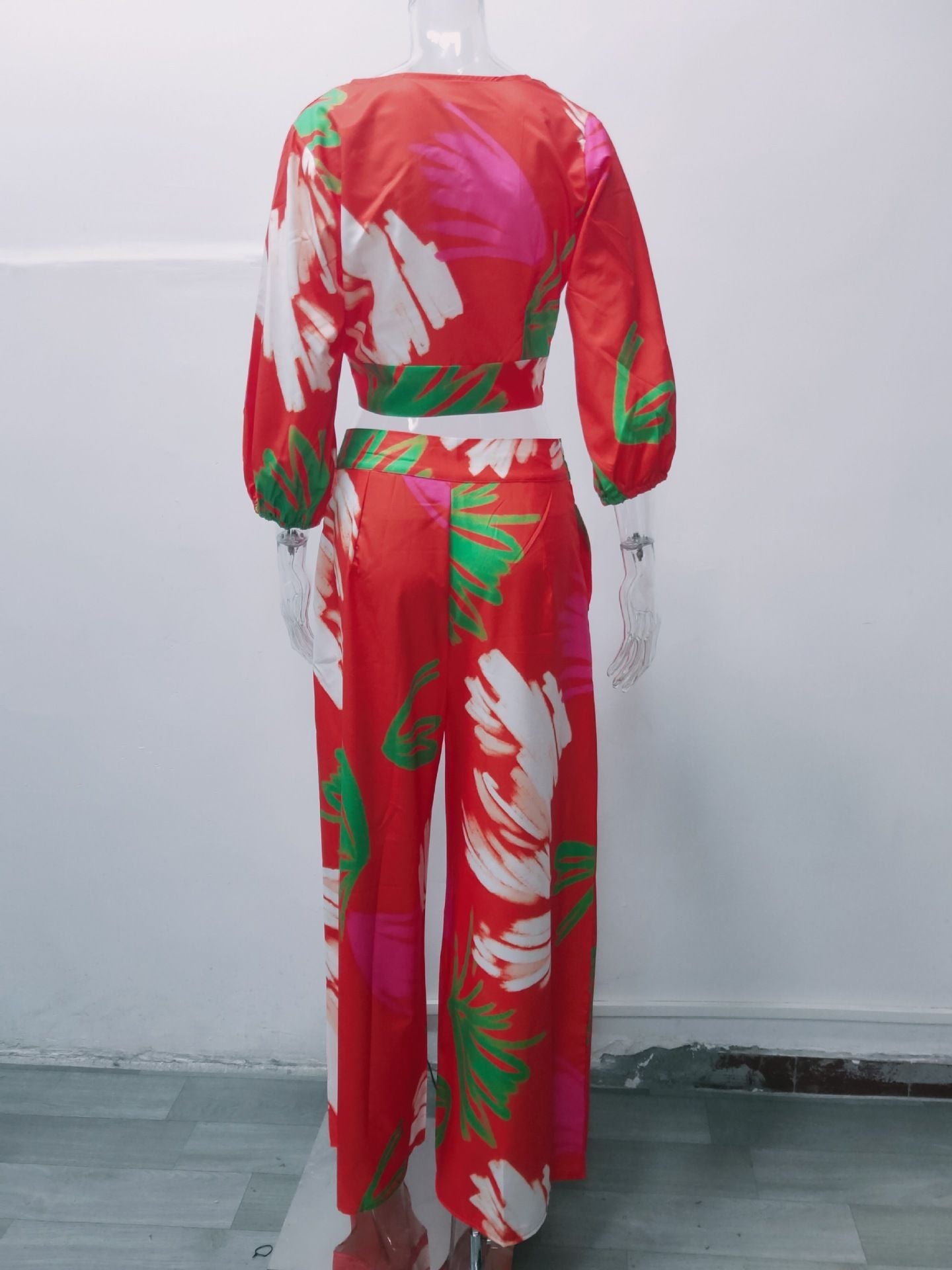 V-Neck, Lantern Sleeve Cropped Top, High-Waisted Wide-Leg Pants, Two-Piece Set