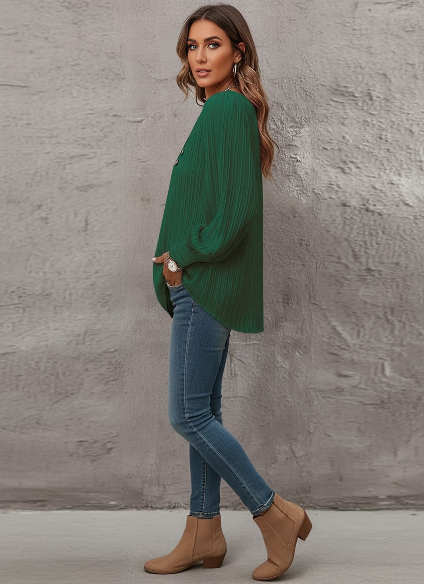 V-Neck Button Solid Color Versatile Long Sleeve Pleated Shirt