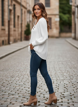 V-Neck Button Solid Color Versatile Long Sleeve Pleated Shirt