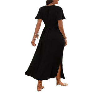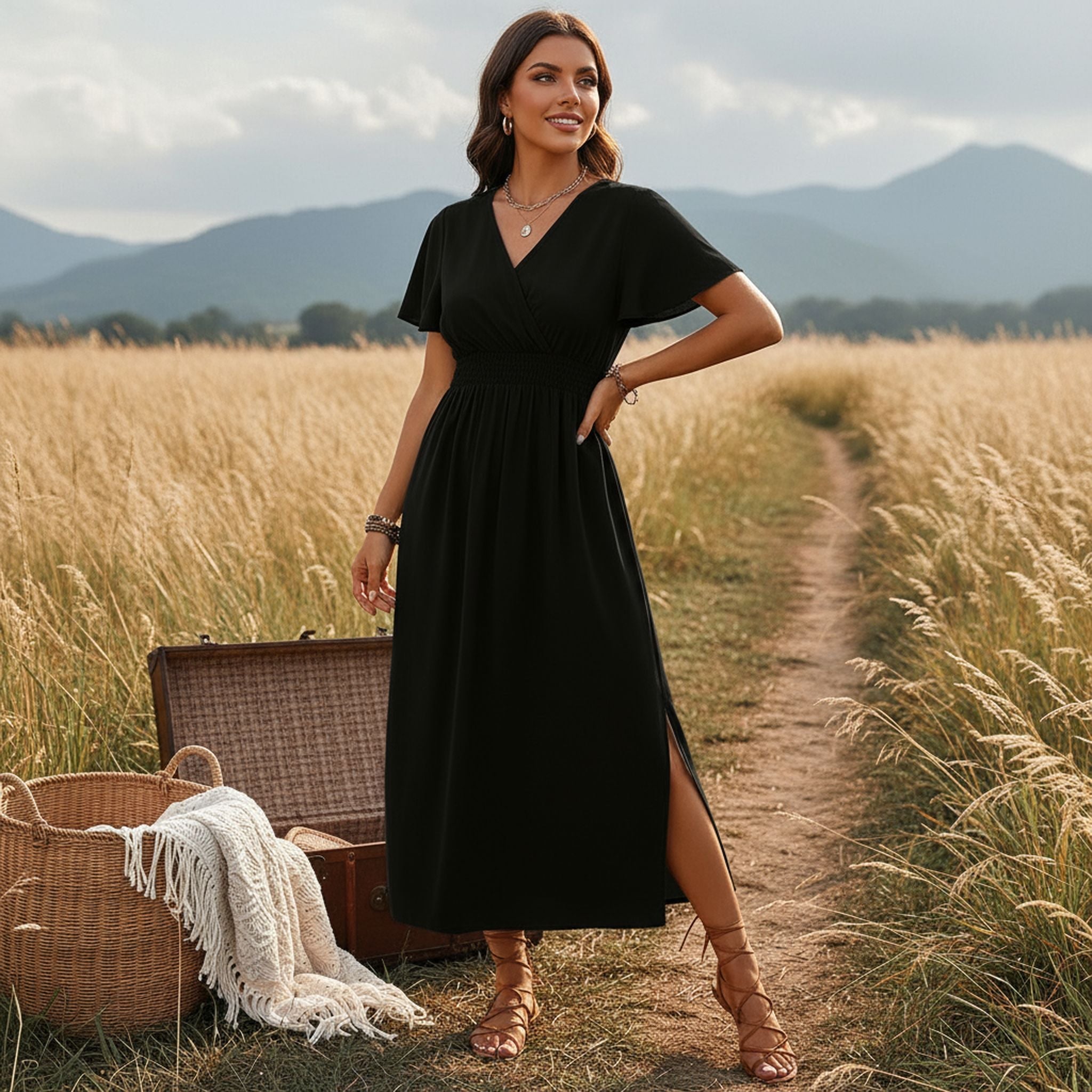 New Solid Color V-Neck Flared Sleeves Elasticated Waist Slimming Slit Long Skirt