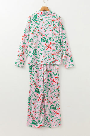 Pink Christmas Berries Plant Print Satin Long Sleeve Pajama Set