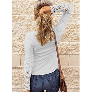 Crew Neck Buttons, Patchwork Lace Sleeves, Loose Solid Color, Long Sleeve T-Shirt