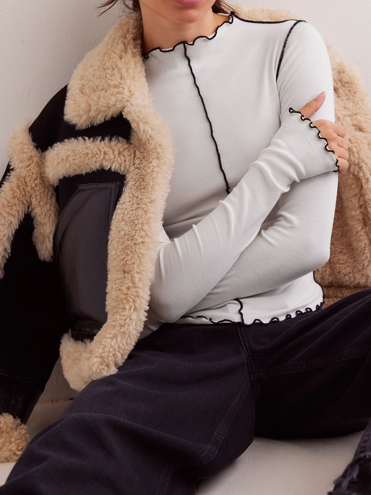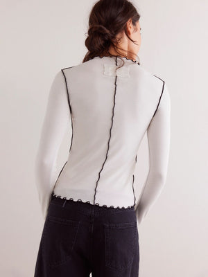 New Contrasting Rolled Edge Semi-Turtleneck Long-Sleeved T-Shirt