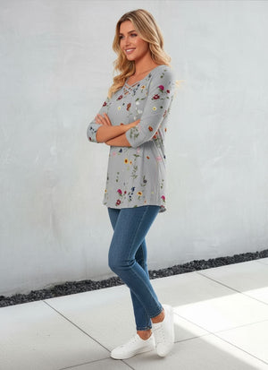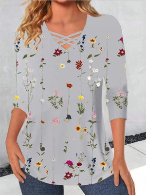 New Loose Neckline Cross V-Neck Flower Print Long Sleeve T-Shirt