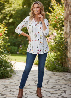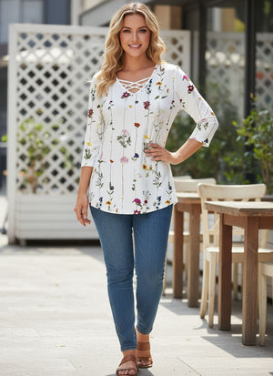 New Loose Neckline Cross V-Neck Flower Print Long Sleeve T-Shirt