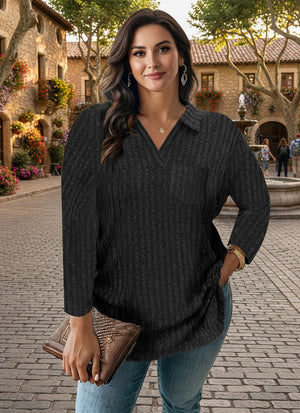 V-Neck Pocket Loose Pit Strip Long-Sleeved T-Shirt Top For Women