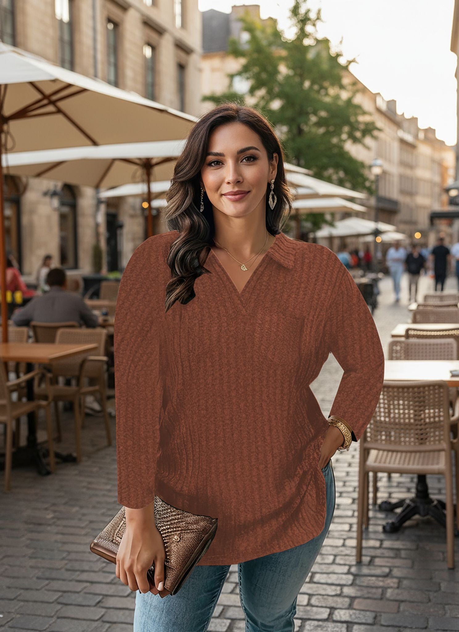 V-Neck Pocket Loose Pit Strip Long-Sleeved T-Shirt Top For Women